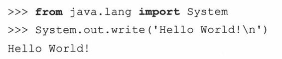 惟一的不同是,现在,你不得不等待Java那超长的启动时间。如果你能忍受这个,你就能做一些更有用的事了。用Jython交互解释器的一个更有趣的方面就是,现在你可以用Java来写“Hello World!”了:
