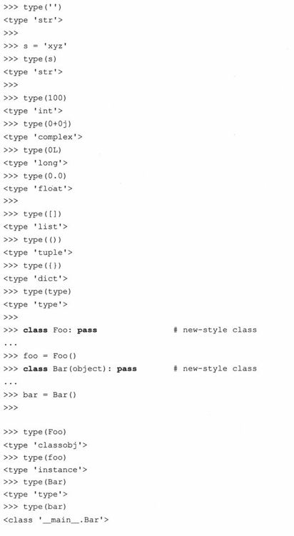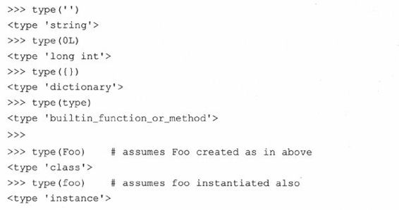 在这一章的前面部分我们讨论了对象的值比较和身份比较,如果你了解其中的关键点,你就会发现我们的代码在性能上还不是最优的。在运行时期,只有一个类型对象来表示整型类型。也就是说, type(0),type(42),type(-100)都是同一个对象<type ‘int’> (types.IntType也是这个对象)。