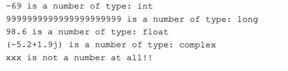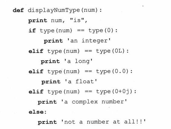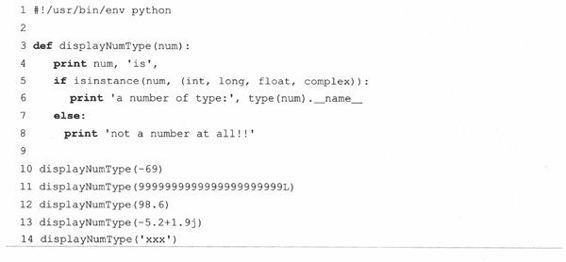函数displayNumType()接受一个数值参数,它使用内建函数type()来确认数值的类型(或不是一个数值类型)。