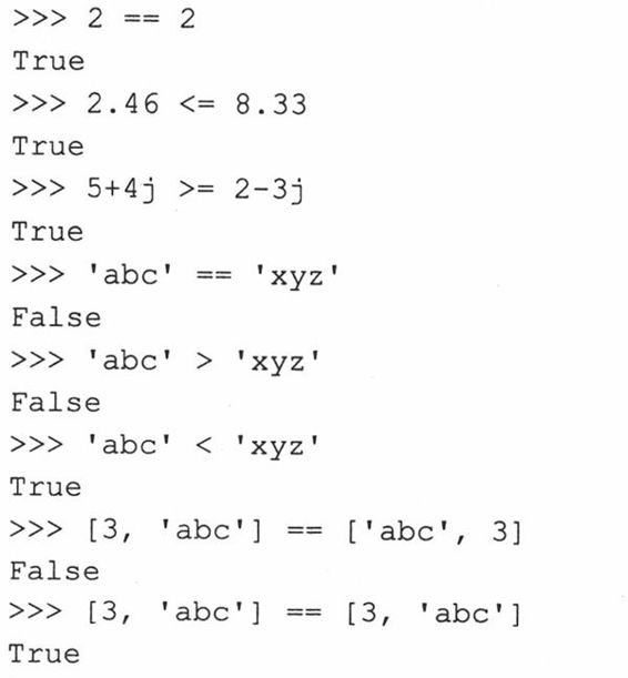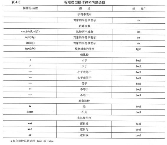 比较操作符用来判断同类型对象是否相等,所有的内建类型均支持比较运算,比较运算返回布尔值True或False。如果你正在使用的是早于Python2.3的版本,因为这些版本还没有布尔类型,所以会看到比较结果为整型值1 (代表True)或0 (代表False)。