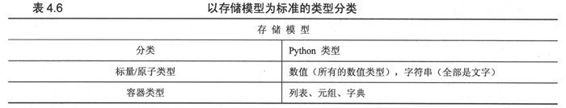 我们对类型进行分类的第一种方式,就是看着这种类型的对象能保存多少个对象。Python的类型,就像绝大多数其他语言一样,能容纳一个或多个值。一个能保存单个字面对象的类型,我们称它为原子或标量存储;那些可容纳多个对象的类型,我们称之为容器存储(容器对象有时会在文档中被称为复合对象,不过这些对象并不仅仅指类型,还包括类似类实例这样的对象)。容器类型又带来一个新问题,那就是它是否可以容纳不同类型的对象。所有的Python容器对象都能够容纳不同类型的对象。表4.6按存储模型对Python的类型进行了分类。