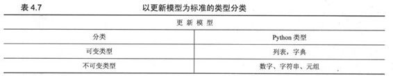 另一种对标准类型进行分类的方式就是,针对每一个类型问一个问题:“对象创建成功之后,它的值可以进行更新吗?”在前面我们介绍Python数据类型时曾经提到,某些类型允许他们的值进行更新,而另一些则不允许。可变对象允许他们的值被更新,而不可变对象则不允许他们的值被更改。表4.7列出了支持更新和不支持更新的类型。