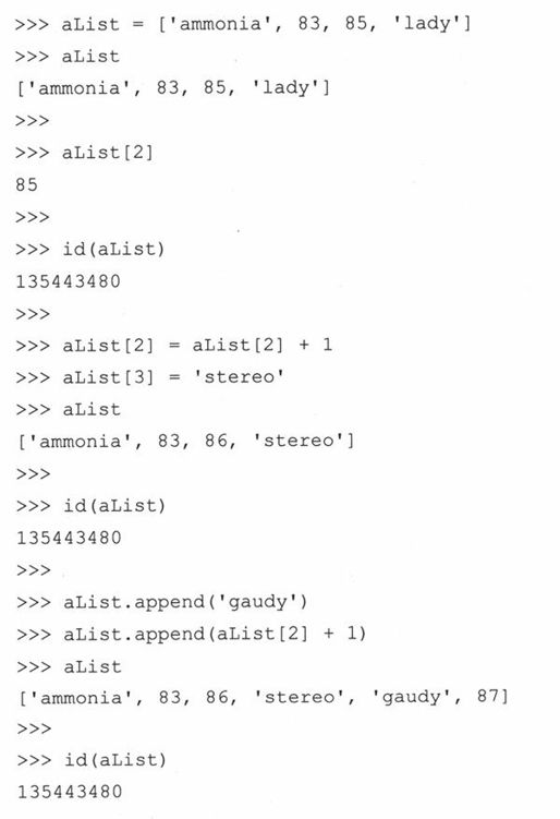 你看到的身份数字很可能和我不同,每次执行这些数字也会不同,这是正常的。这个数字与该对象当时分配的内存地址密切相关。因此不同的机器、不同的执行时间都会生成不同的对象身份。另一类对象,列表可以被修改而无须替换原始对象,请看下面的例子。