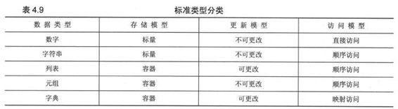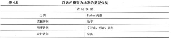 尽管前面两种模型分类方式在介绍Python时都很有用,它们还不是区分数据类型的首要模型。对这种目的,我们使用访问模型。也就是说根据访问我们存储的数据的方式对数据类型进行分类。在访问模型中共有三种访问方式:直接存取、顺序和映射。表4.8按访问方式对数据类型进行了分类。