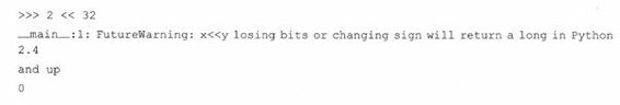 在Python2.3中,这个操作产生一个警告,不过在2.4版里移除了这个Warning,并且这步操作生成了一个真正的长整型。
