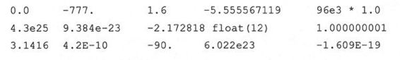 浮点型值通常都有一个小数点和一个可选的后缀e (大写或小写,表示科学计数法)。在e和指数之间可以用正(+)或负(-)表示指数的正负(正数的话可以省略符号)。下面是一些典型的浮点型值的例子。