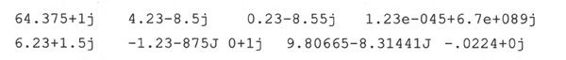 注意指数操作符的优先级高于连接实部和虚部的+号操作符。就上面最后一个例子来说,我们人为的加上了括号,这就改变运算顺序,从而得到我们想要的结果。