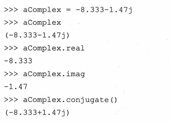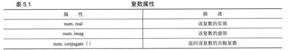 复数对象拥有数据属性(参见4.1.1节),分别为该复数的实部和虚部。复数还拥有conjugate方法,调用它可以返回该复数的共轭复数对象(两头牛背上的架子称为轭,轭使两头牛同步行走。共轭即为按一定的规律相配的一对——译者注)。