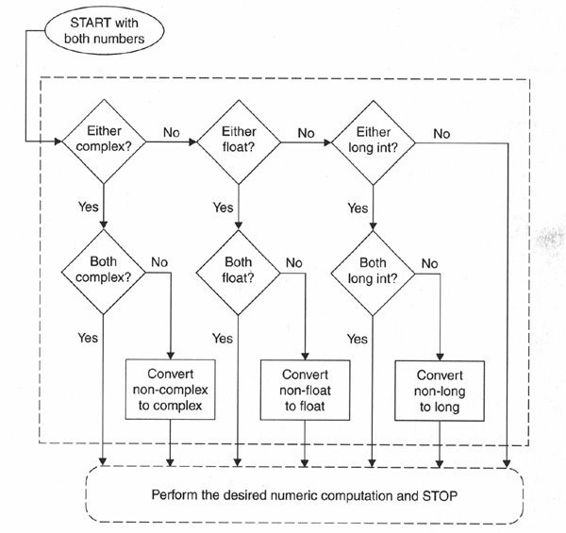 图5-1的流程图阐释了强制转换的规则。数字类型之间的转换是自动进行的,程序员无须自己编码处理类型转换。不过在确实需要明确指定对某种数据类型进特殊类型转换的场合,Python提供了 coerce()内建函数来帮助你实现这种转换。(见5.6.2小节)