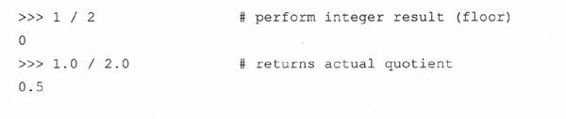 拥有C背景的程序员一定熟悉传统除法——也就是说,对整型操作数,会执行“地板除”(floor,取比商小的最大整型。例如5除以2等于2.5,其中“2”就称为商的“地板”,即“地板除”的结果。本书中使用“地板除”的说法是为了沿用原作者的风格,译者注)。对浮点操作数会执行真正的除法。然而,对第一次学编程的人或者那些依赖精确计算的人来说,可能就需要多次调整代码才能得到自己想要的结果。