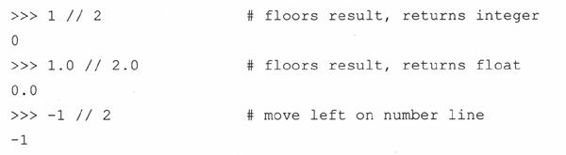 从Python 2.2开始,一个新的操作符//已经被增加进来,以执行地板除://除法不管操作数为何种数值类型,总是舍去小数部分,返回数字序列中比真正的商小的最接近的数字。