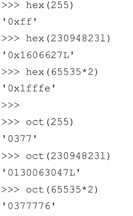 前面我们已经看到,除了十进制标准,Python整型也支持八进制和十六进制整型。除此之外,Python还提供了两个内建函数来返回字符串表示的八进制和十六进制整型,它们分别是oct()和hex()。它们都接受一个整型(任意进制的)对象,并返回一个对应值的字符串对象。下面是几个示例。