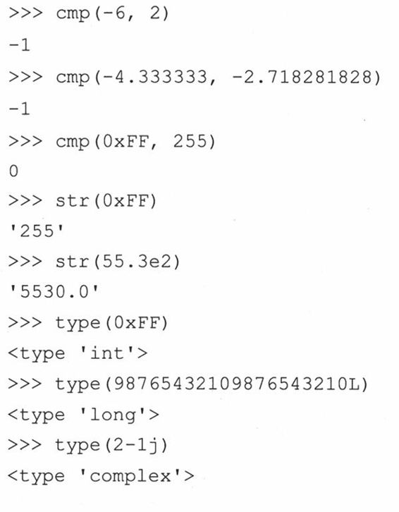 第4章中,我们介绍了 cmp()、str()和type()内建函数。这些函数可以用于所有的标准类型。对数字对象来说,这些函数分别比较两个数的大小,将数字转换为字符串,以及返回数字对象的类型。