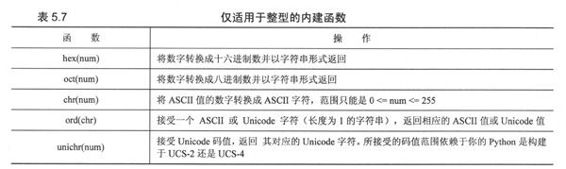 除了适应于所有数值类型的内建函数之外,Python还提供一些仅适用于整型的内建函数(标准整型和长整型)。这些函数分为两类,一类用于进制转换,另一类用于ASCII转换。
