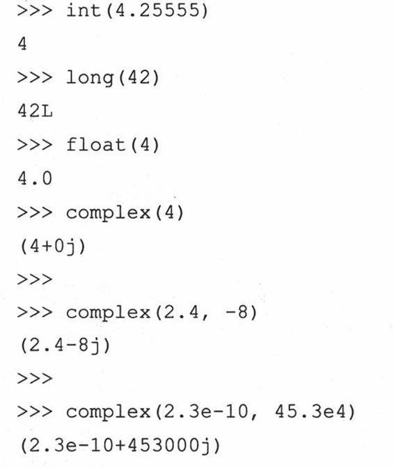 函数int()、long()、float()和complex()用来将其他数值类型转换为相应的数值类型。从Python 1.5版本开始,这些函数也接受字符串参数,返回字符串所表示的数值。从Python 1.6版开始,int()和long()在转换字符串时,接受一个进制参数。如果是数字类型之间的转换,则这个进制参数不能使用。
