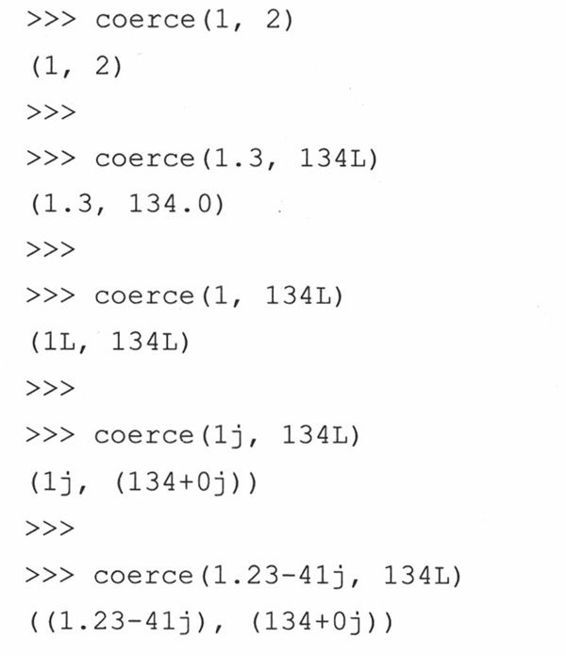 函数coerce(),尽管从技术上讲它是一个数据类型转换函数,不过它的行为更像一个操作符,因此我将它放到了这一小节。在5.5.1小节,我们讨论了 Python如何执行数值类型转换。函数coerce ()为程序员提供了不依赖Python解释器,而是自定义两个数值类型转换的方法。对一种新创建的数值类型来说,这个特性非常有用。函数coerce()仅返回一个包含类型转换完毕的两个数值元素的元组。下面是几个例子。