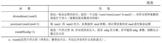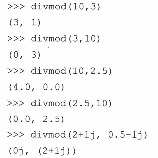 divmod()内建函数把除法和取余运算结合起来,返回一个包含商和余数的元组。对整型来说,它的返回值就是地板除和取余操作的结果。对浮点型来说,返回的商部分是math.floor (num1/num2),对复数来说,商部分是 ath.floor((numl/num2).real)。