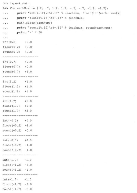 下面的例子用4个正数和4个负数作为这三个函数的参数,将返回结果列在一起做个比较(为了便于比较我们将int()函数的返回值也转换成了浮点型)。