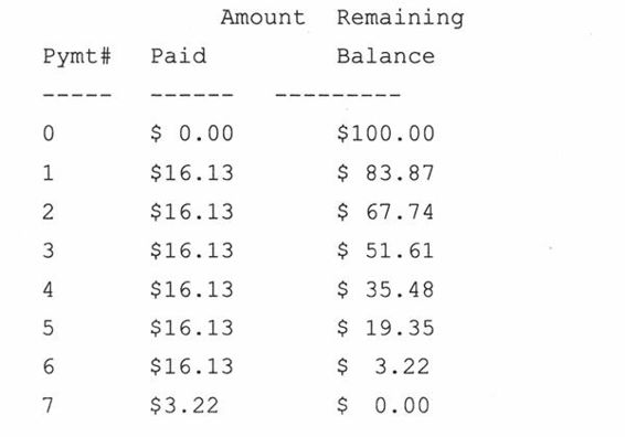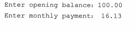 5-16.家庭财务。给定一个初始金额和月开销数,使用循环,确定剩下的金额和当月的支出数,包括最后的支出数。Payment()函数会用到初始金额和月额度,输出结果应该类似下面的格式(例子中的数字仅用于演示)。