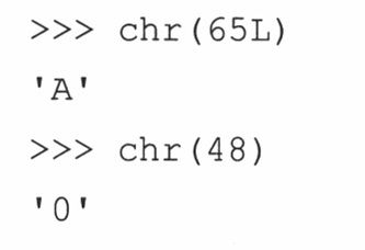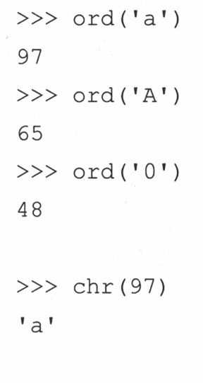 Python也提供了 ASCII (美国标准信息交换码)码与其序列值之间的转换函数。每个字符对应一个唯一的整型(0〜255)。对所有使用ASCII表的计算机来说,这个数值是不变的。这保证了不同系统之间程序行为的一致性。函数chr()接受一个单字节整型值,返回一个字符串,其值为对应的字符。函数ord()则相反,它接受一个字符,返回其对应的整型值。