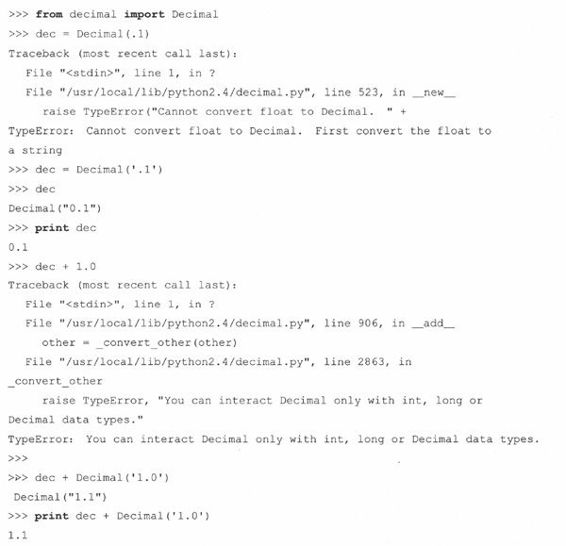 你可以看到,这些片段不停的重复直到舍入出错。如果我们使用十进制来做同样的事情,感觉就会好很多,看上去会有任意的精度。注意下面,你不能混用十进制浮点型和普通的浮点型。你可以通过字符串或其他十进制数创建十进制数浮点型。必须导入decimal模块以便使用Decimal类。