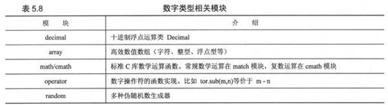 在Python标准库中有不少专门用于处理数值类型对象的模块,它们增强并扩展了内建函数的功能和数值运算的功能。表5.8列出了几个比较核心的模块。要详细了解这些模块,请参阅这些模块的文献或在线文档。