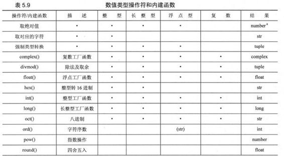 到此,我们的Python数值类型之旅就该结束了。表5.9总结了数值类型的所有内建函数和操作符。